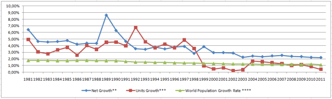O leitor haverá notado que eu inseri nos gráficos acima uma comparação com a taxa de crescimento populacional do mundo, para que se possa contextualizar a comparação do crescimento Mórmon junto ao crescimento populacional do resto do mundo.