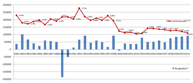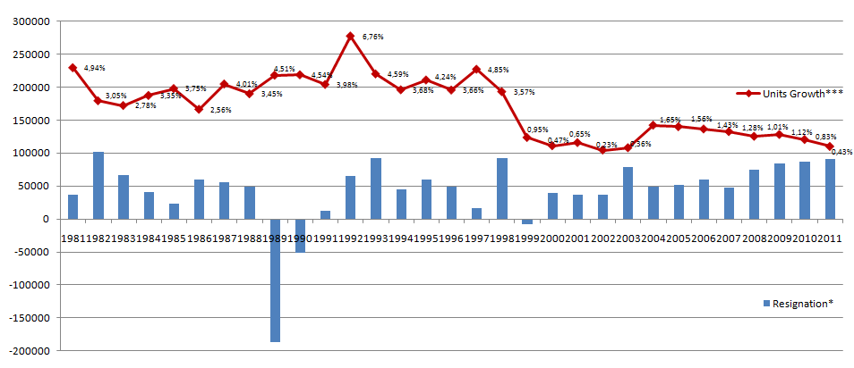 No gráfico abaixo eu ploteei o crescimento de unidades contra a taxa de resignação formal: calculando-se os números totais de membros de cada ano, menos os números de novos conversos e crianças nascidas, tem-se o número oficial de pessoas que deixaram de ser membros, seja por morte, seja por abandono oficial (enviando-se a carta formal de resignação).