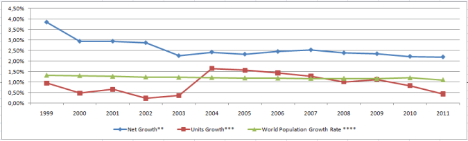 Ver-se-á, portanto, que a Igreja crescia bastante até 1998, com crescimento de membros bem acima do crescimento populacional, mas que esse ritmo cai batante e progressivamente de 1999 para cá. Além disso, nota-se que o crescimento, como medido em unidades ou congregações, esta *abaixo* do crescimento populacional de 1999 para cá, dando a entender que a Igreja cresce apenas em têrmos de taxas de reposição, ou até negativamente.