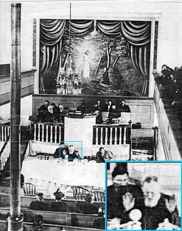 Penso que ele esteja abençoando o sacramento de joelhos e com “mãos santas levantadas” (não lembro onde se estabelece tal prática em D&C). Interessante que ao fundo, no painel, vemos a imagem de Joseph Smith interagindo com um personagem (seria Jesus?). Me pergunto: apesar da versão oficial da Primeira Visão ter sido consagrada ainda no século XIX, será que havia outras versões ainda em voga no meio SUD? Ou seria apenas a representação de uma das várias visões de Joseph e não a primeira?