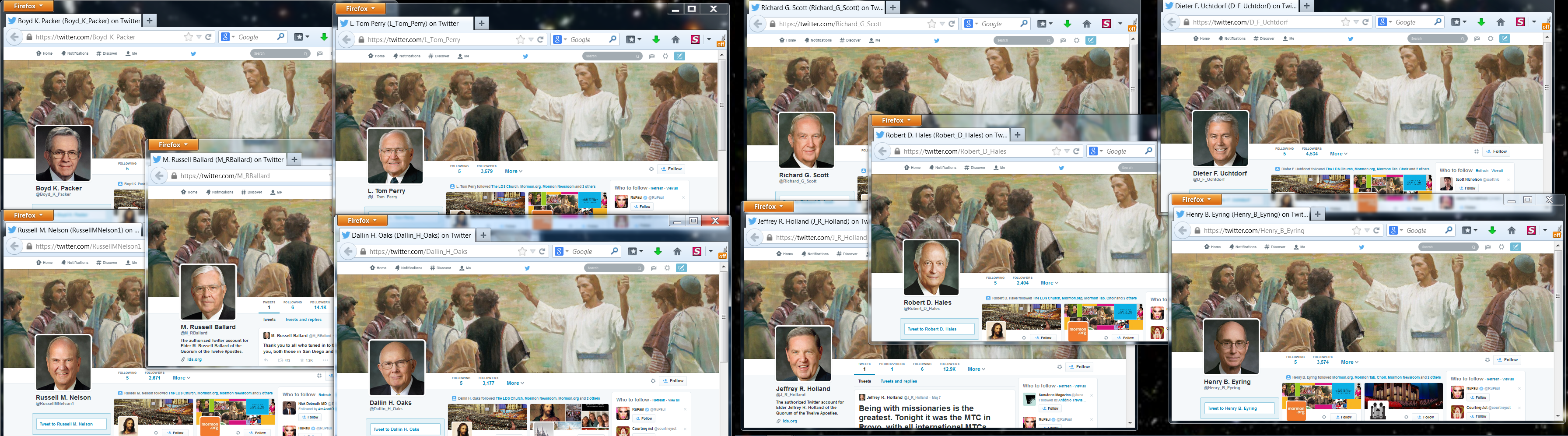 Nesta semana, 14 dos 15 Apóstolos Mórmons abriram contas pessoais no Twitter. Além das páginas oficiais de líderes da Igreja SUD gerenciadas pelo Departamento de Relações Públicas, como a página de Thomas Monson no Facebook, estes líderes eclesiásticos passarão a manejar suas próprias contas nesta rede social.