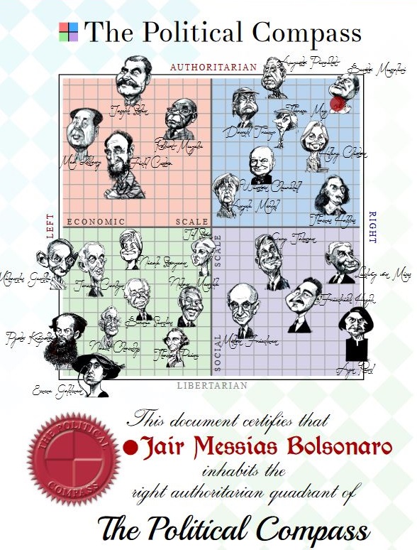 O site oferece um teste de múltiplas escolhas que você pode tomar e ele automaticamente calcula, baseado nas suas respostas, sua posição ideológica dentro do gráfico. Note que se você tentar responder as perguntas com as respostas que Jair Bolsonaro daria, baseando-se em seus muitos pronunciamentos públicos, invariavelmente verá que sua posição ideológico é mais próxima de Benito Mussolini, pai do Fascismo. Convidamos todos a tentarem por si mesmos e postarem seus resultados (pessoais e à la Bolsonaro) nos comentários abaixo.