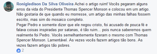 Pegar Pedro e somente dizer que ele negou cristo, foi acusado de pouca fé e falava coisas inspiradas por satanas, é tão ruim… pois nunca saberemos quem realmente foi Pedro. Vocês semelhantemente fizeram o mesmo com Thomas Spencer Monson. Lamentável. As vezes vocês fazem artigos tão bons. As vezes fazem artigos tão pobres.”