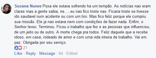 Poxa ele estava sofrendo ha um tempão. As notícias nao eram claras mas a gente sabia, ne…..eu nao fico triste nao. Ficaria triste se tivesse ido saudavel num acidente ou com um tiro. Mas fico feliz porque ele cumpriu sua missão. Ele ja nao estava nem com condições de fazer nada. Enfim, o Senhor levou. Terminou. Ficou o trabalho que fez e as pessoas que influenciou, de um jeito ou de outro. A morte chega pra todos. Feliz daquele que a recebe idoso, em casa, rodeado de amor e com uma vida inteira de trabalho. Vai em paz. Obrigada por seu serviço.