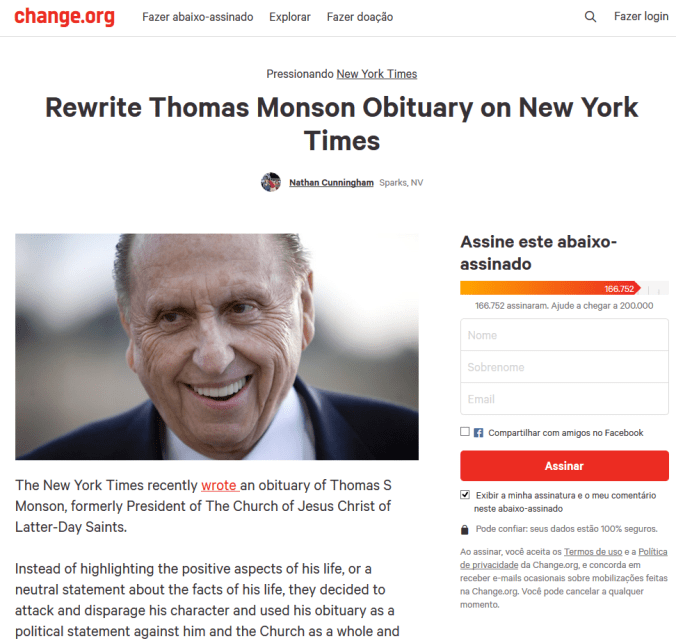 Petição assinada por mais de 166 mil mórmons, até a data de hoje, exigindo do New York Times que “Reescreva o obituário de Thomas Monson no New York Times”