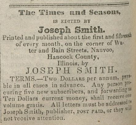 Nota oficial a roda-pé desta mesma edição indicando que o jornal The Times and Seasons era editado por Joseph Smith e impresso por Joseph Smith:
