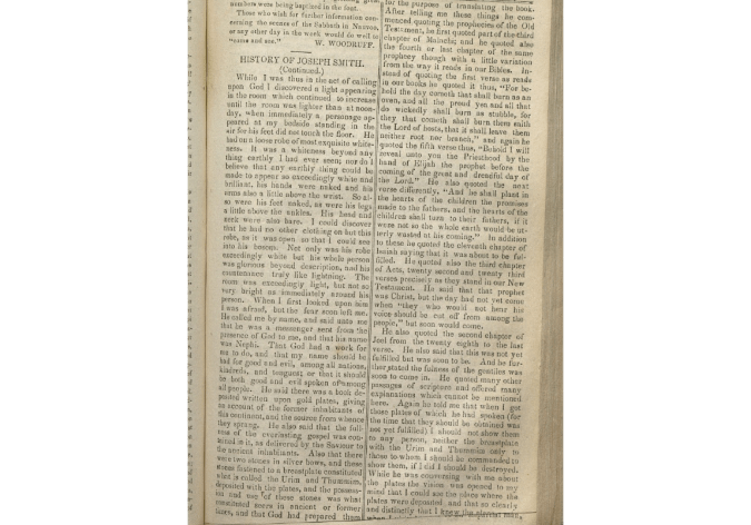 O manuscrito em questão é a transcrição original da narrativa de Smith, hoje conhecida por historiadores como o segundo rascunho, produzida entre junho e novembro de 1839 na caligrafia de Mulholland, e sob dicção e supervisão direta do Profeta. O primeiro rascunho, ditado por Smith e anotado por Mulholland, não reconta essa narrativa, e portanto, não menciona o suposto anjo ou tal visitação.
