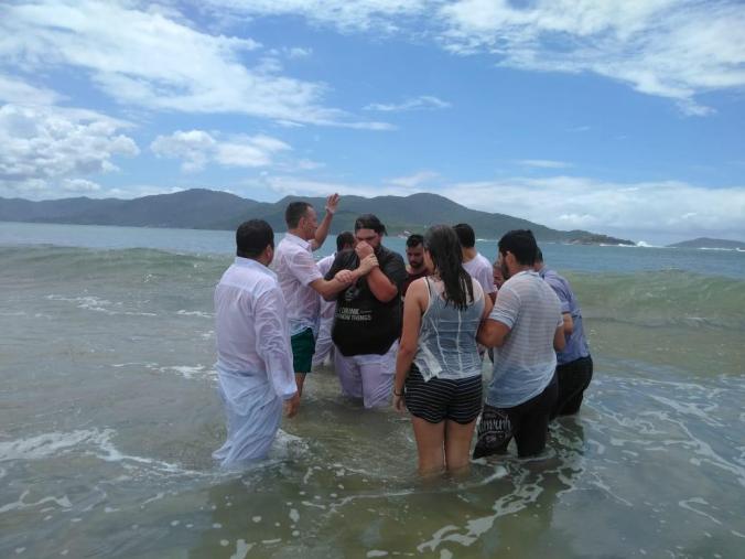 No dia do batismo, um domingo pela manhã, dia 28 de outubro de 2018. Fomos até a praia, o local escolhido foi a Praia do Sonho, em Palhoça, SC. Era verdadeiramente uma visão celestial, um lindo mar, praia branca, natureza, um antigo forte ao fundo, e o mar. Ah, o mar.