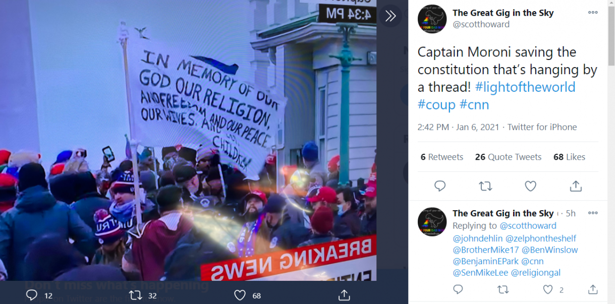 Em protesto que resultou na invasão do Congresso americano e uma morte, bandeira inspirada no Livro de Mórmon foi vista entre apoiadores do presidente Donald Trump.